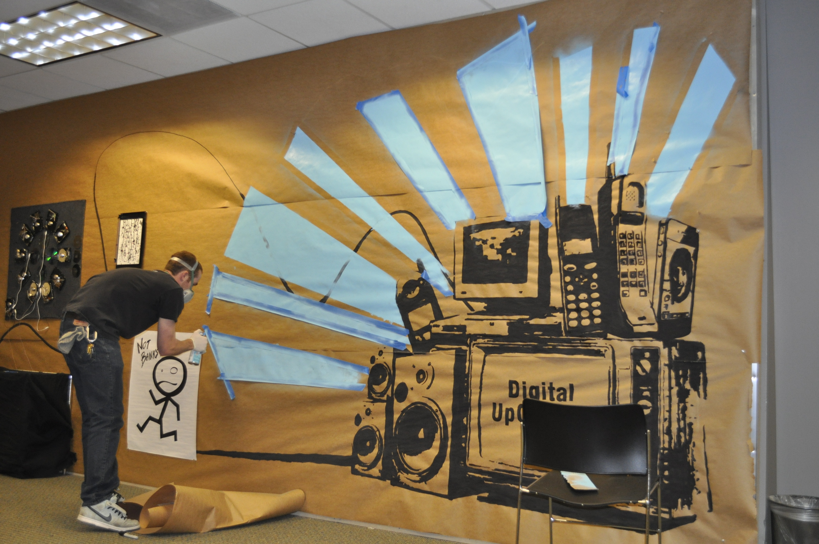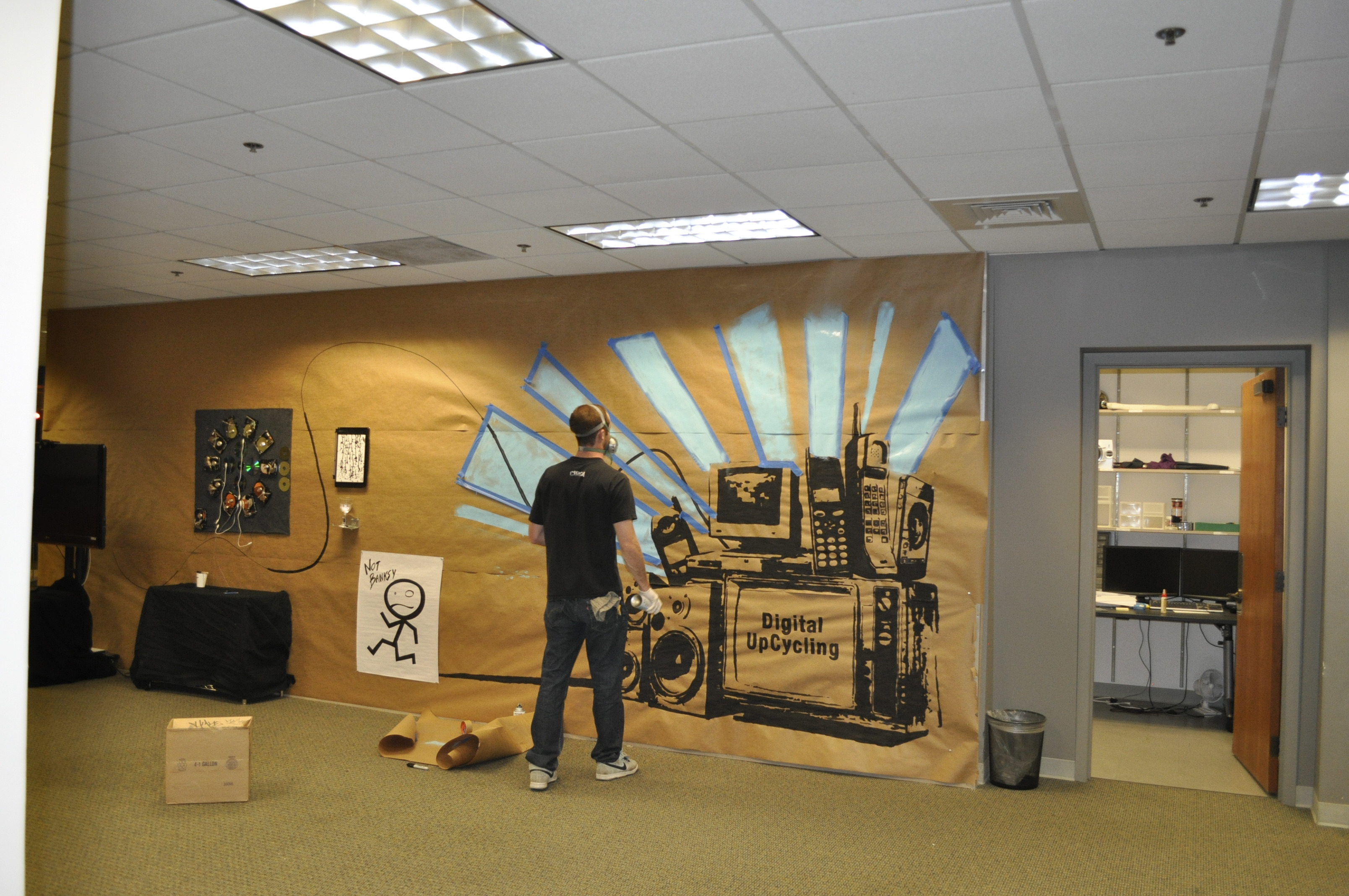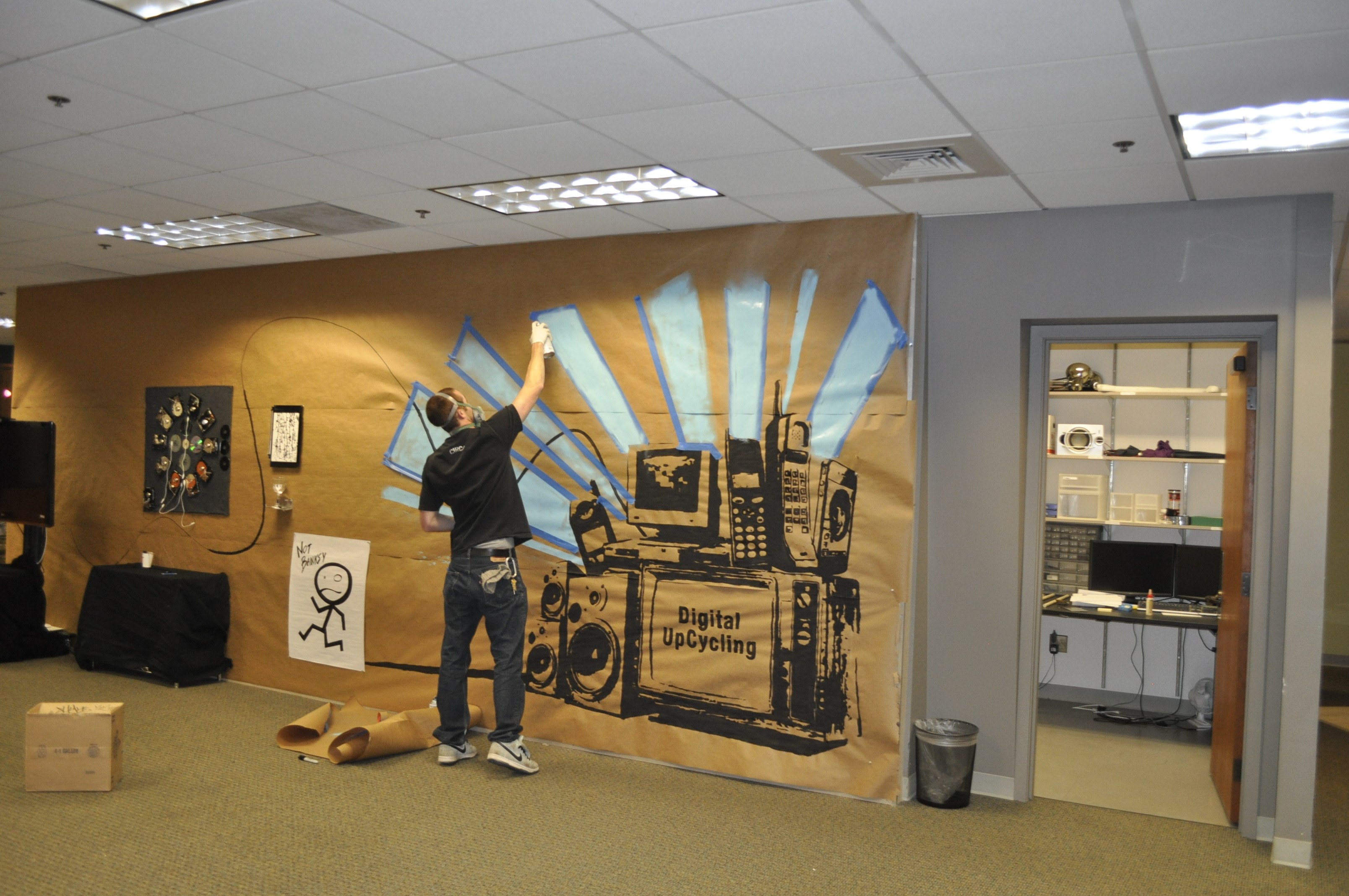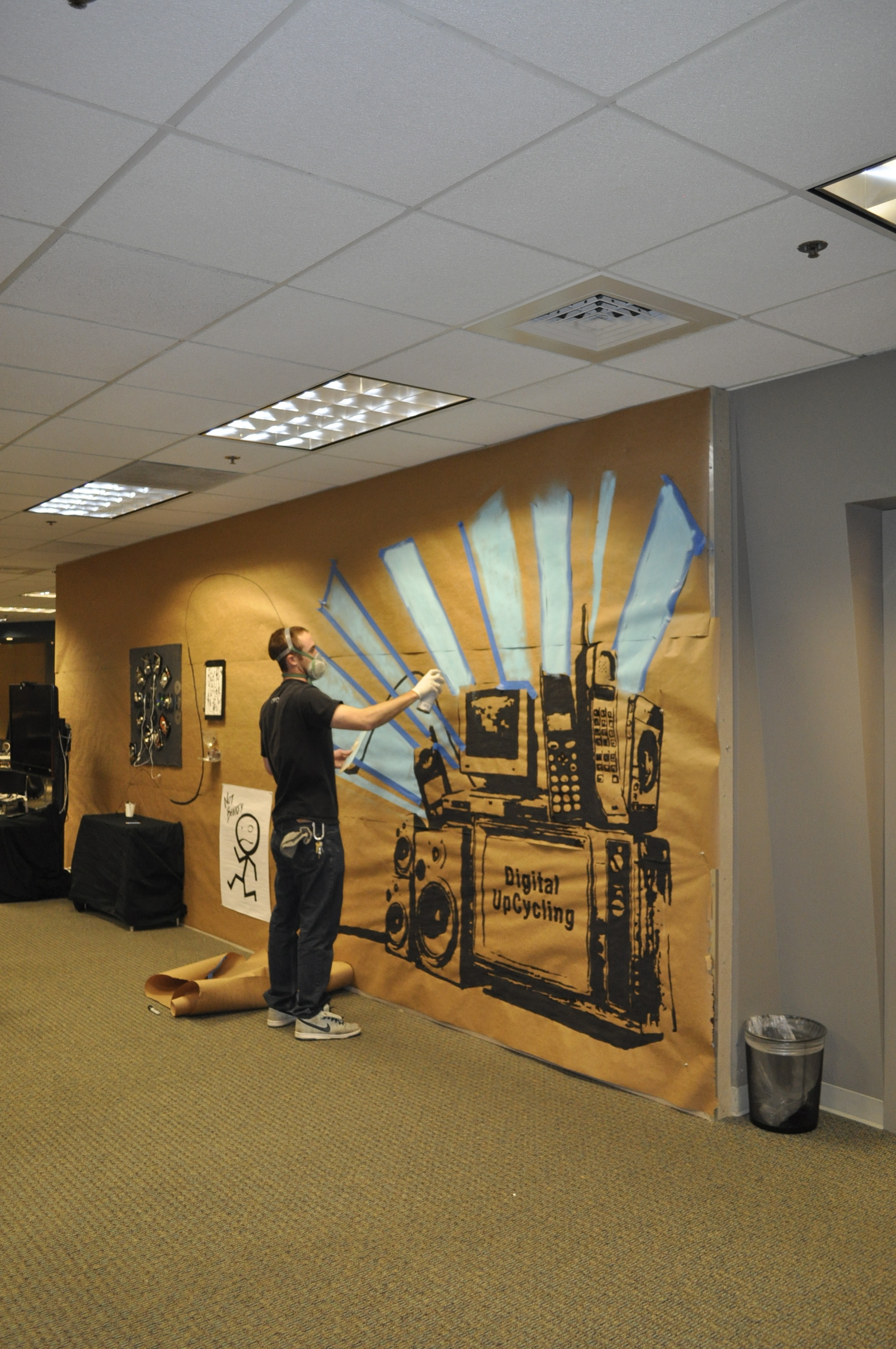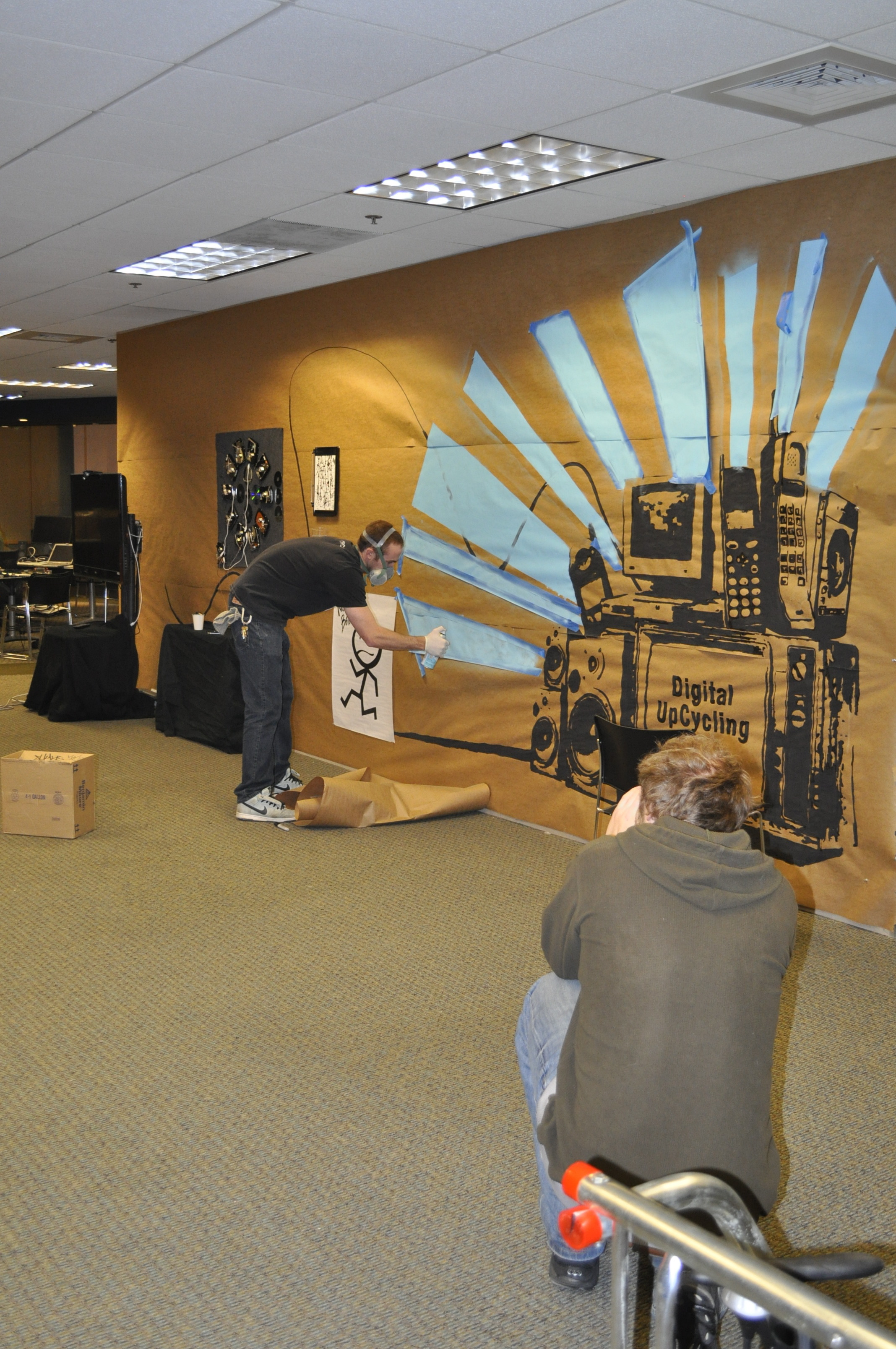 The mural was painted directly on kraft paper across a full wall, combining spray paint, stencil, and freehand work. The central image — a towering stack of retro electronics with a “Digital UpCycling” motif and a sun-ray burst — was built up in layers throughout the day as the event unfolded around it.